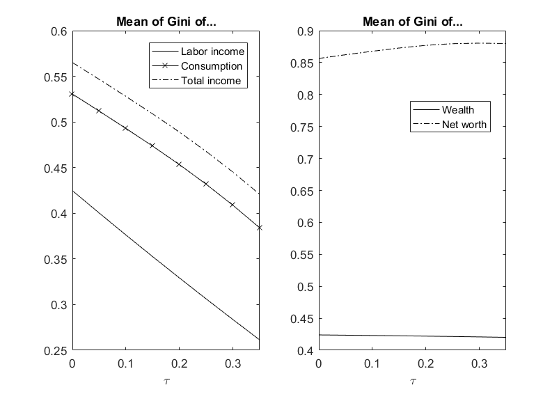 Finally, we can make a statement about different forms of inequality in the tax-regime case (see Figure 14). As already stated, the flat tax rate and labor income inequality can be related in a simple linear manner. Inequality of consumption, however, is above labor income inequality. In this region, the gap between these two forms of inequality increases due to consumption out of net worth (stock) as well as the total income inequality stemming from capital income. This effect can be attributed to the higher net worth (stock) inequality (documented in the right panel of Figure 14). Thus, the inequality of total income (i.e. capital and labor income \(x_i=y_i-rD_i\)) also decreases less than the inequality of (pure) labor income. While the tax is able to address the effects of flow inequality, the resulting increase in mutual debt/credit positions eventually increases the stock value of net worth inequality.