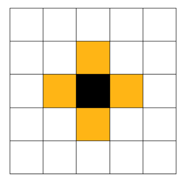 Agents in the Axelrod Model interact probabilistically with neighboring agents on the grid based on their degree of similarity. Here, a "neighbor" of a given agent is defined as any agent located one unit step away from the chosen agent (see Figure 1), and the similarity of two agents is based on the fraction of traits the two agents share.