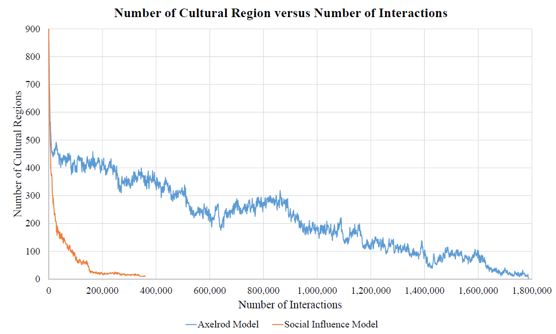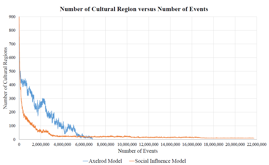 We next track the number of cultural states in each model over the course of their evolution to a final absorbing state. Figure 10 shows representative examples of these evolutions. Observe that the number of cultural regions in the Social Influence and Axelrod Model both initially decline sharply. However, the decline in Social Influence Model tends to be steep (e.g., it declines to 200 cultural regions after approximately 300,000 events whereas the Axelrod Model requires over 3,000,000 events to attain this same diminution) and then curve notably flattens for a long period. In contrast, in the Axelrod Model, after the initial rapid descent, the decline continues in a more moderate, relatively steady manner.