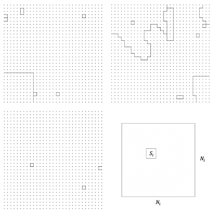 Second, to account for the space in the lattice being taken up by the regions of different sizes, we start with an empty lattice and imagine sequentially filling it, beginning with the smallest region and moving on to progressively larger regions. At each step in this iterative process, we look at the remaining space available in the lattice and treat this remaining space as though it were a smaller, square lattice, and then compute how many configurations are available to the current region as we insert it into this reduced lattice. We continue in this manner until the largest region has been inserted, at which point the full lattice is filled. The motivation for sequencing from small to large is based on the observation that small regions are effectively unconstrained in where they can appear within the lattice - e.g., a small region can easily appear as an island within a larger region. In other words, large regions are not effective at blocking small regions (see, for instance, the lower left graph of Figure 12).