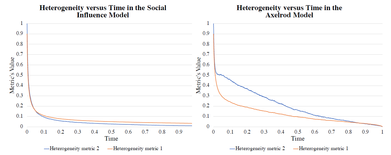 We next use the above three heterogeneity metrics to gain deeper insights into the behaviors of the Social Influence and the Axelrod models, and in particular to better understand and quantify the emergence of heterogeneity.
