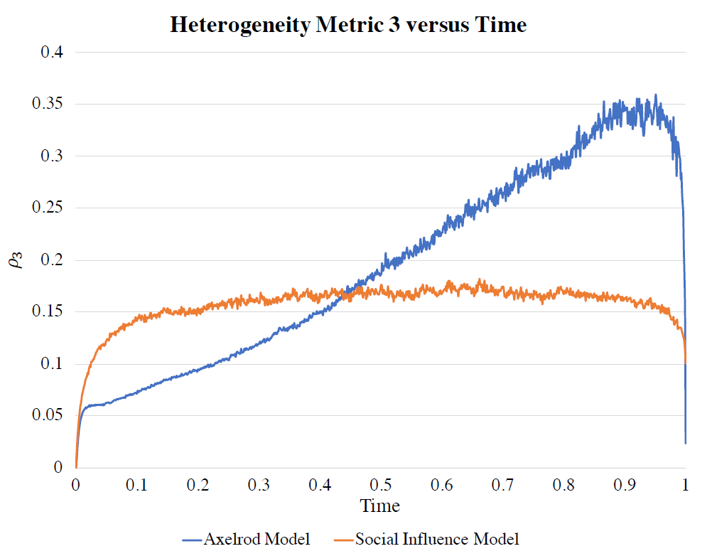 In Figure 13, we can see a clear distinction between the Social Influence and Axelrod models for the first two disorder metrics. In the Axelrod Model (right), both disorder metrics asymptote (at time=1) very close to zero, indicating the preponderance of a single ordered (homogeneous) absorbing state in a large fraction of the runs. The asymptotic values of \(\rho_1, \rho_2\) for the Social Influence Model are also very close to zero, though they do remain higher those for the Axelrod model (this small difference is somewhat obscured in the figure owing to the scale of the graph, and the normalization used for the metrics).