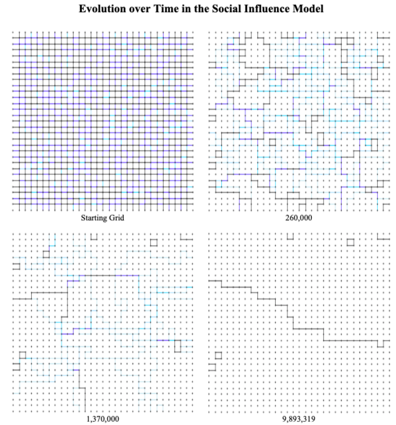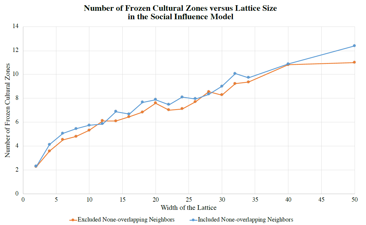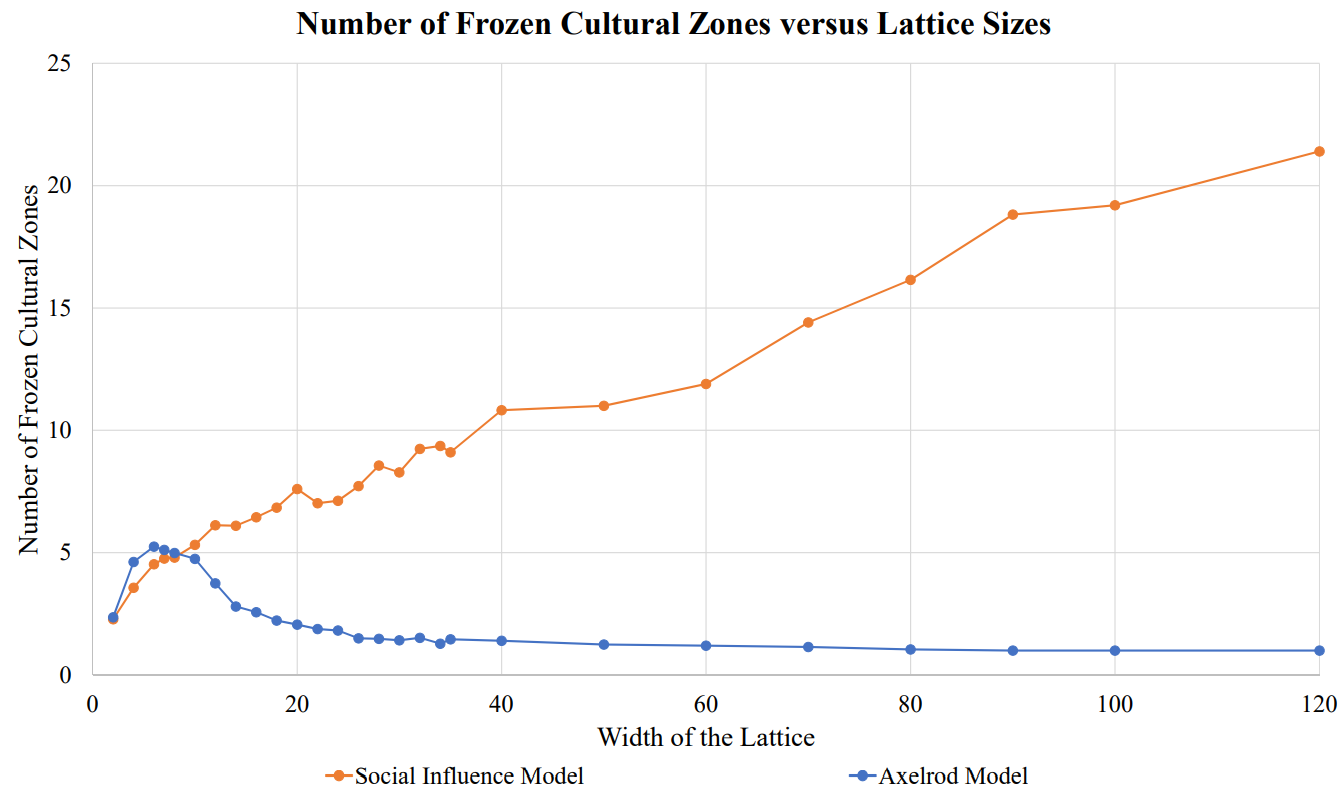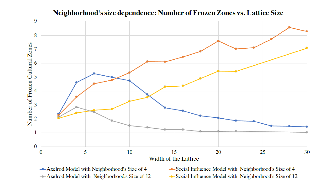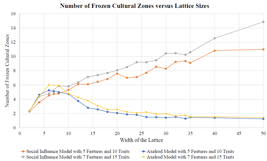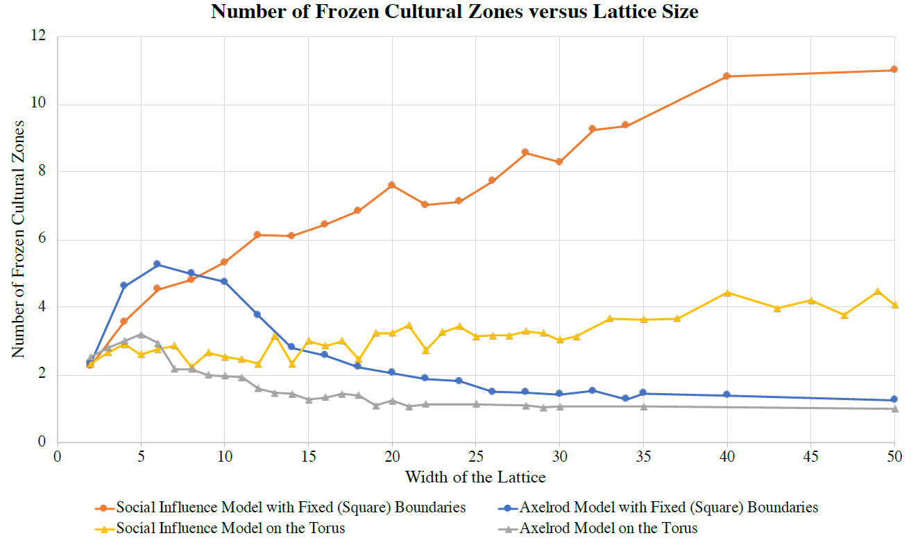 Note that this starting lattice (on the left of the figure) has one large dominant cultural region and five smaller regions that each share only one trait with the dominant region. The simulations reveal that once the system reached a final absorbing configuration, the result was a mono-culture in a large majority of the runs. Specifically, the simulations resulted in a mono-culture in 75\(\%\) of the runs for the Axelrod Model and in 90\(\%\) of the runs for the Social Influence Model. This indicates that the dominant-regions effect is at work in both models (and appears in fact to be modestly stronger in the Social Influence Model). This effect helps to explain the decline in the overall level of heterogeneity seen in the Axelrod model, since larger grids facilitate larger cultural regions, and by the dominant-regions effect these larger regions will absorb the smaller regions around them, becoming even more dominant as they grow, thereby creating a positive feedback loop that typically results in a final, mono-cultural absorbing state. In short, for the Axelrod model we see that the multiplicity effect favoring heterogeneity wins out over the dominant-regions effect for small lattice sizes, but for large lattice sizes the dominant-region effects favoring homogeneity begins to predominate (Figure 3). However, this explanation seems to fail for the Social Influence Model and in fact presents a paradox: Given that the dominant-regions effect is in fact moderately stronger in the Social Influence Model than the Axelrod model, why does the number of frozen zones in the Social Influence Model continue to increase with region size (Figure 3)?