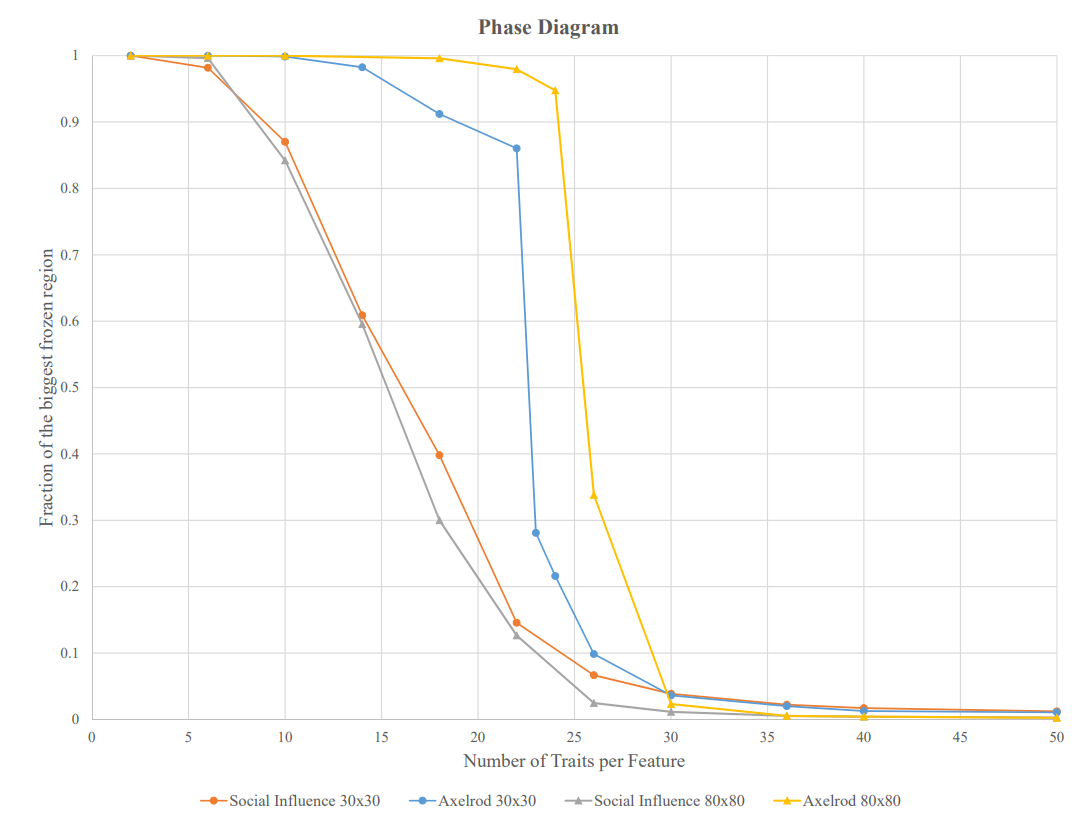 Our first finding, illustrated in Table 1, concerns the number of distinct zones in the absorbing states. Data derived from 100 runs of both the Social Influence Model and the Axelrod Model on a \(30\times30\) grid, with five features (\(F=5\)) and ten traits per feature (\(Q=10\)), shows that the Social Influence Model has many more frozen zones compared to the corresponding Axelrod Model at those same parameter values.