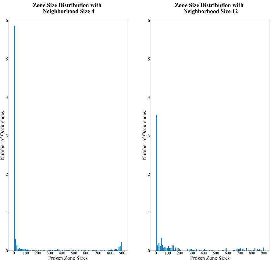 Figure 19 shows the distribution of zone sizes for the original neighborhood size (4) and the expanded neighborhood size (12). For the expanded neighborhood, observe that there are fewer frozen zones per run on average compared to the smaller neighborhood. Moreover, an expanded neighborhood leads to a higher occurrence of moderate-size zones (e.g., of sizes 20-200).