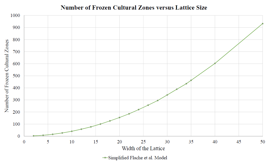 In our Social Influence Model we observed (see Figures 3 and 6) a marked increase in diversity compared to the original Axelrod model owing to the introduction of a neighborhood-based social-influence factor into our model. It is interesting to test how sensitive this finding is to the details of the particular social-influence factor we used. Towards this end, we numerically examined the corresponding behavior in an earlier social-influence-type model first studied by Flache & Macy (2011). In order to make this comparison, we first stripped down the Flache & Macy (2011) model by removing a perturbative component in the model that allowed it to evolve indefinitely. By removing this component, an absorbing state can be reached and the number of frozen zones counted. Flache & Macy (2011) anticipated that there should be an increase in heterogeneity associated with their social-influence factor. We confirmed this finding - see Figure 20 - but observed some features which warrant discussion. Most notably, a comparison of Figure 20 with Figure 3 shows that the while both models exhibit similar qualitative amplification of heterogeneity with lattice size, the actual number of frozen zones in the Flache & Macy (2011) model is manyfold larger. We believe this can be traced to an essential difference in how social influence is incorporated into each model. In our Social Influence Model, the algorithm is such that the system will always evolve into an absorbing state in which the agents in a given frozen zone never share any trait values in common with agents in a neighboring frozen zone. However, in the Flache & Macy (2011) scheme, the social-influence algorithm employed uses a type of minimum-threshold update rule. This in turn means that once an absorbing state is reached, it is possible that the agents in one frozen zone may still have a trait value for a given feature which is the same at that of an agent in an adjacent frozen zone. Owing to this possibility of ‘trait overlap’ between frozen zones, the resulting total number of frozen zones in this case is notably larger than in the Social Influence Model. Despite these quantitative differences, however, we emphasize that both social-influence schemes produce an increase in diversity with lattice size, suggesting that despite quantitative differences, the underlying qualitative mechanism promoting diversification operates similarly in both systems.