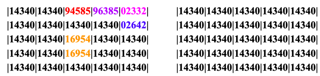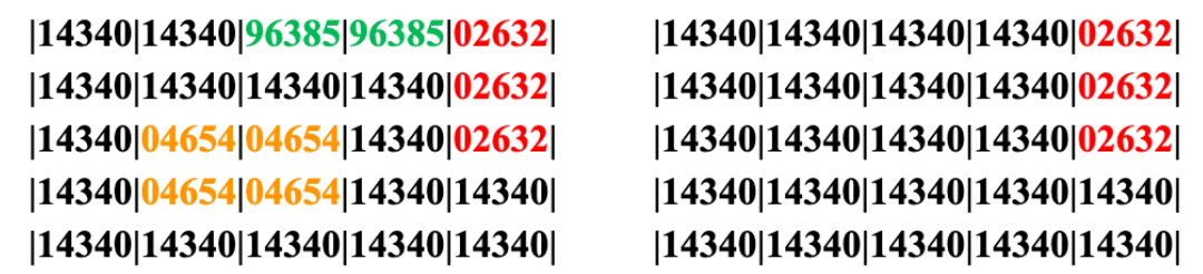 | \[\begin{aligned} \textbf{[0,0] [0,0] [0,0] [0,0] [0,0] [0,0] [0,1] [0,1] [0,1] [0,1] }\end{aligned}\] | \[(9)\] |