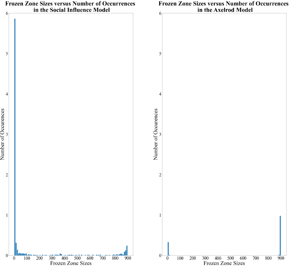 We next examine the distribution of the sizes of frozen cultural zones. Figure 6 shows the results a \(30\times30\) grid with \(F=5\) and \(Q=10\) averaged over 100 runs. In both the Axelrod Model and the Social Influence Model, the majority of frozen zones were either very small - i.e., consisting of just one or two agents - or very large, covering most of the lattice. But there were some important differences. The Social influence model, for instance, exhibited on average 3.8 single-agent zones per run, compared to just 0.2 single-agent zones for the Axelrod Model. This can be understood as follows. Due to the exceedingly large number of possible feature/trait combinations for an agent (\(F^Q\)), during the initial random setup of the individual agents’ cultural profiles, the probability that a given agent will have no traits in common with any of its nearest neighbors (and hence constitute a single-agent zone) is \((1-1/Q)^4 \approx 0.66\). As described above, zone boundaries tend to be more robust in the Social Influence Model and less likely to be subsumed by large surrounding regions, so we would expect more single-agent zones to have survived once the system settles into an absorbing state compared to the Axelrod Model.