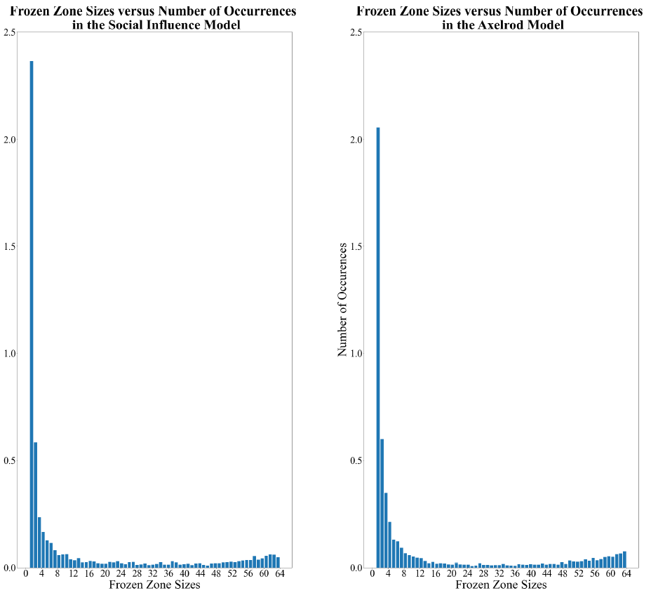 It is also interesting to briefly consider frozen-zone size distributions using a small \(8\times8\) lattice, which, as seen in Figure 3, corresponds to the lattice size at which the average number of frozen zones in both the Social Influence Model and Axelrod Model are nearly equal. The zone size distributions are shown in Figure 7. Notably, we find that these distributions are highly similar, suggesting that the differences in the dominant-region effects in the two models first become manifest for grid sizes larger than \(8\times8\).