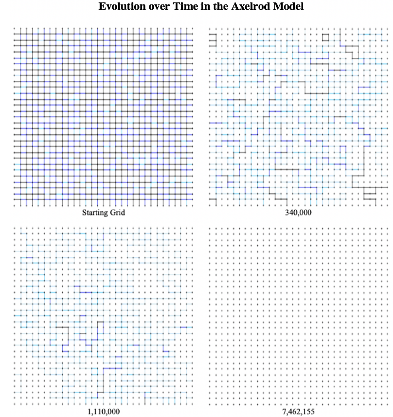 AXELROD, R. (1997). The dissemination of culture: A model with local convergence and global polarization. Journal of Conflict Resolution, 41(2), 203–226. [doi:10.1177/0022002797041002001]