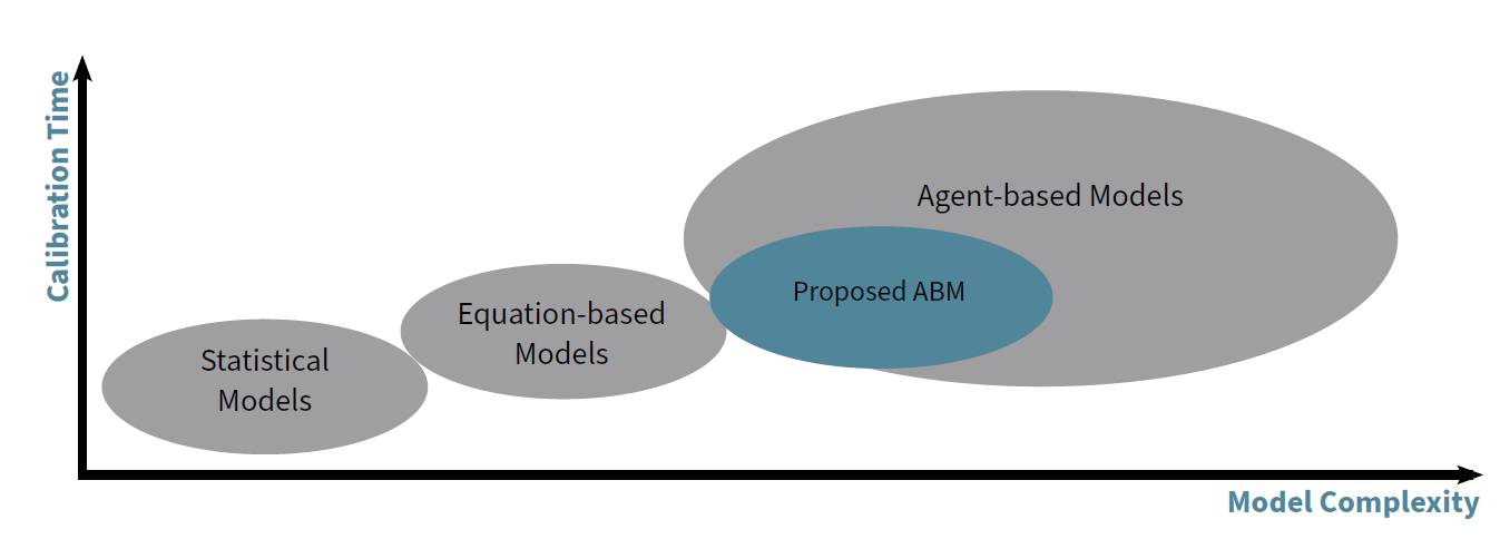 In Figure 1 we arrange the three categories according to their complexity and calibration effort and place the our proposed ABM within this context.