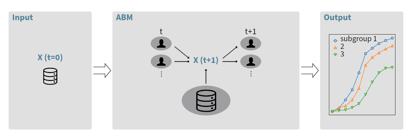 In the beginning of this section, we will discuss the input and output of an empirical ABM of Innovation Diffusion (Figure 2, left and right boxes). Inputs to an ABM are independent of the modeling procedure. They consist of external data sets and the model initialization. External data is highly relevant if the model aims to reproduce empirical data (Salgado & Gilbert 2013). As an example, if one is investigating the diffusion of a new product and there are regions where agents are wealthier, more of them might buy the new product. Therefore, a data set of income or wealth is helpful for the model to produce good results. If there is no data available, one can also use submodels to produce the desired attribute. If one knows the average income in a region, a very simple submodel could assign an income to each agent according to a general income distribution which has the known mean value. The performance of an empirically grounded ABM is always limited by the quality of the explanatory data, so researchers have to identify the relevant data sets.