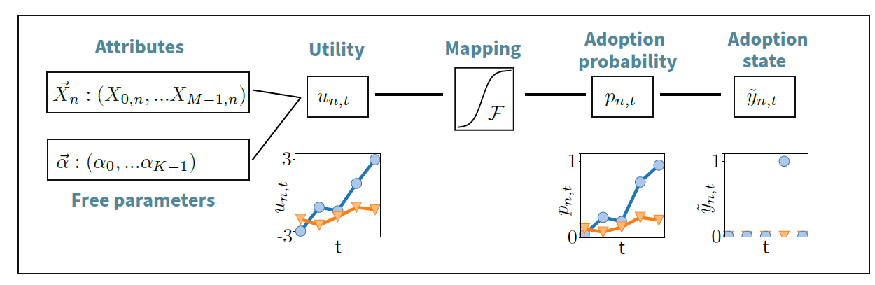 The utility \(u_{n,t}\) is then mapped to an adoption probability \(p_{n,t}\) by using a mapping function \(\mathcal{F}\):
