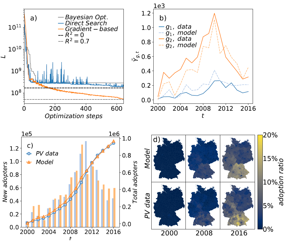 The data set \(Y(g,t)\) consists of \(6817\) data points, each representing the number of adopters in one specific district \(g\) and one year \(t\). The chosen model utility is a weighted sum as in Equation 4 with \(25\) free parameters and \(\mathcal{F}\) is the CDF of the gaussian distribution, so that we end up with the Gaussian Model as described in Section 4. The largest model used during the calibration consists of \(1.6\) million agents. A detailed description of the PV diffusion model and its input data can be found in the appendix.