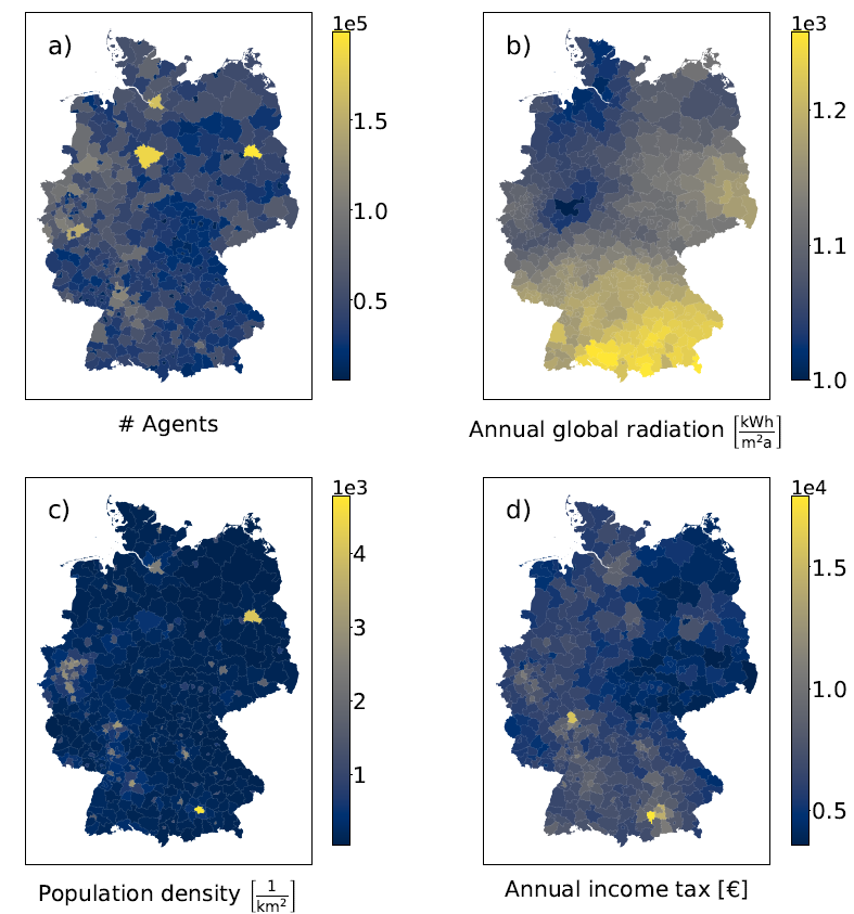 To test the calibration with gradients, we will model the data set of small-scale photovoltaic adoption in Germany from \(2000-2016\). The model will be calibrated to match the number of new adopters in the 401 districts of Germany at 17 consecutive years. Special attention is paid to the convergence of the calibration and the quality of the fit. First, we will compare the gradient-based calibration with two gradient-free calibration methods. Second, we will evaluate the prediction of the calibrated ABM.