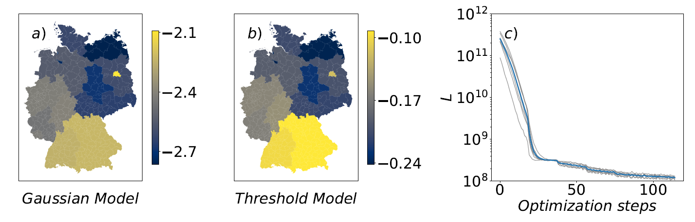 For the Gaussian Model, the gradient in Equation 11 is exact up to the approximation in Equation 6. In the deterministic Threshold Model, the probability density function \(f\) appearing in all summands of the gradient is the Dirac delta function \(\delta(u_{n,t})\). It is only nonzero for \(u_{n,t}=0\). This results in the gradients being zero, which makes the optimization impossible. Since the Threshold Model appears quite often in recent studies, an effective calibration method for this model is of special relevance. We bypass the problem of vanishing gradients by setting the probability distribution function \(f(u_{n,t})=1\) in the gradient of the Threshold Model. The strongest argument supporting this idea is the fact that those approximated gradients can be used to achieve good results comparable to the Gaussian Model in Section 5.