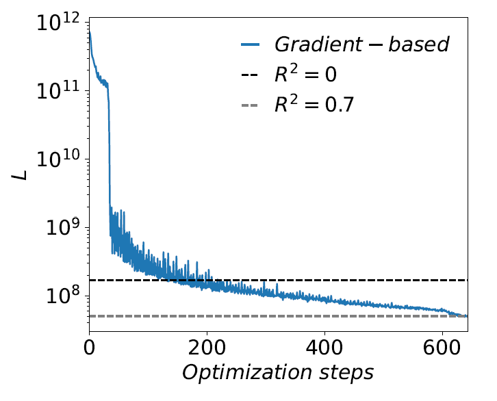 The result can be seen in Figure 4a. The ABM can be fitted to \(R^2 \simeq 0.7\) with the gradient-based Adam Optimizer. For the first \(600\) steps, the number of agents in the model is increased linearly up to \(640,000\) agents. For the last steps, a larger number of agents is added per step, which explains the small bend of the curve. The model size used for the gradient-free direct search method is passed for the gradient-based optimization at the \(600th\) step, where the quality of the fit is already above \(R^2=0.6\).