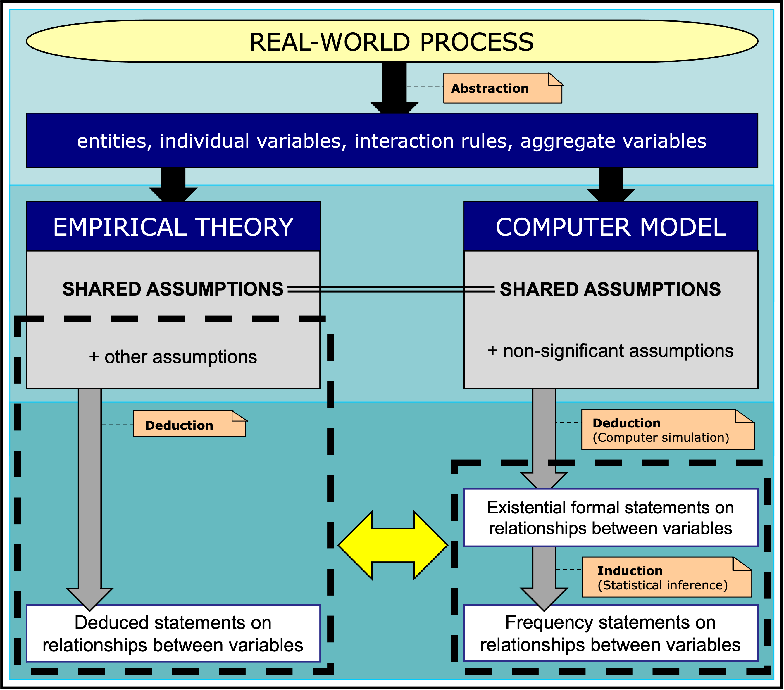 The basic framework we wish to put forward in this paper is sketched in Figure 1. An empirical theory is created from a certain real-world process by identifying key entities, individual variables, interaction rules and aggregate variables. The empirical theory is defined by a certain set of assumptions (‘shared assumptions + other assumptions’ in Figure 1). Now let us consider a computer model that contains some of the assumptions in the empirical theory (‘shared assumptions’ in Figure 1) plus potentially some other assumptions that are not significant (‘non-significant assumptions’ in Figure 1). Non-significant assumptions are those that do not affect the logical consequences of the computer model significantly. If the computer model generates (formal) evidence that contradicts some of the assumptions in the empirical theory or some of its implications, then the empirical theory is shown to be inconsistent. This is because the computer model would be producing logical consequences of the shared assumptions, which are contained in the empirical theory.
