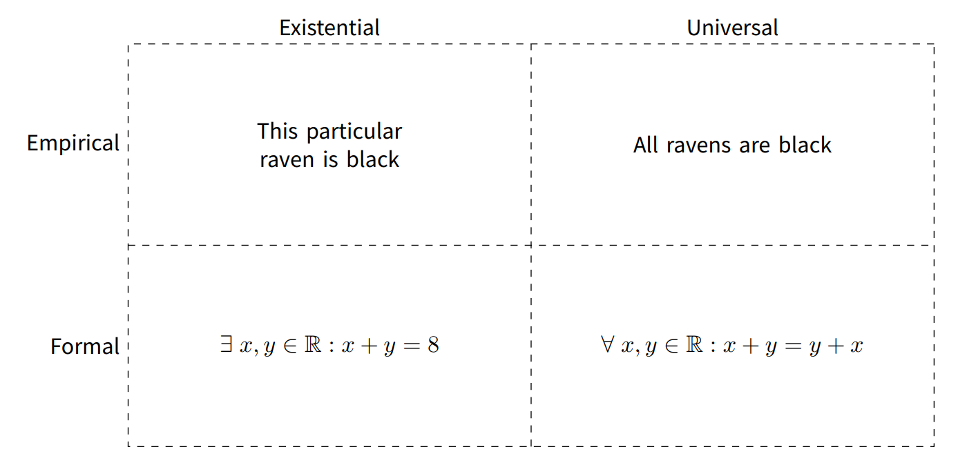 Examples of the different combinations of formal/empirical and universal/existential statements are shown in Figure 2.