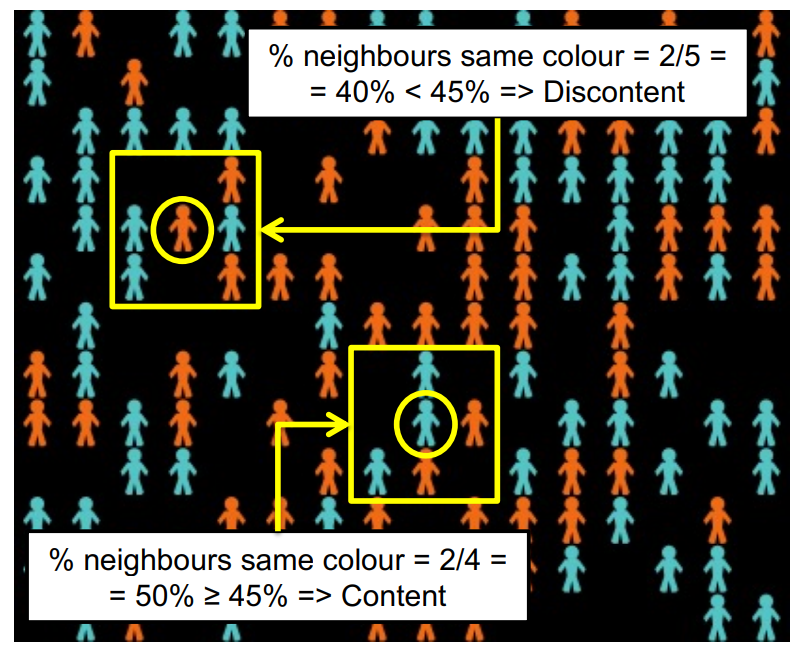 - Each individual agent is content if it has no Moore neighbours, or if at least \(\alpha \%\) of its neighbours are of its same colour. Otherwise, the agent is discontent.