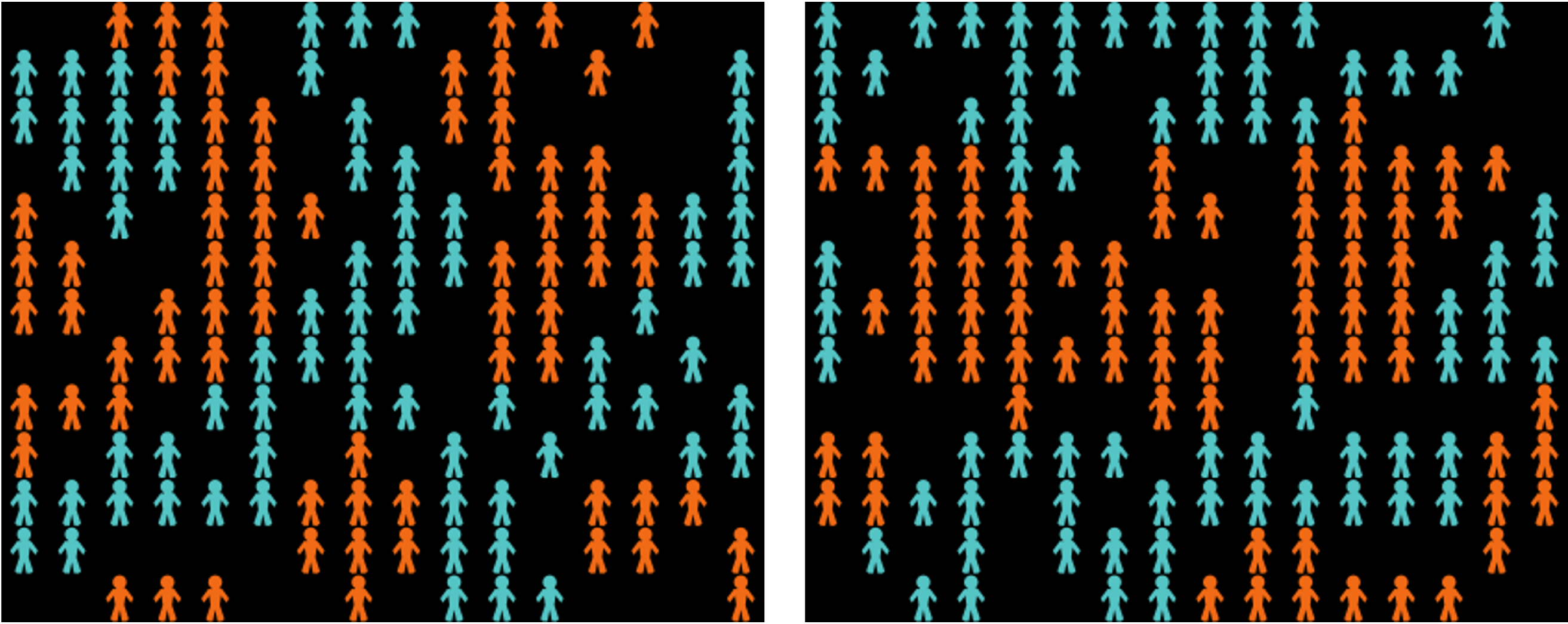 Model \(\textbf{M}(n,\alpha)\) is completely specified and could be implemented in many different programming languages and also studied mathematically. To see it as a Markov chain, we can define the state of the system as a vector of dimension \(13*16=208\), where each component corresponds to a certain cell in the grid. Every component of this vector can take 3 different values to denote whether the cell is empty, occupied by a blue agent or occupied by an orange agent. With this definition, the number of possible states is \(L = \binom{208}{\frac{n}{2}, \frac{n}{2}, 208-n}\); the two snapshots in Figure 4 show two different states for a model where \(n=138\) (which implies \(L=6.87382\times 10^{96}\), a number greater than the estimated number of atoms in the observable universe).