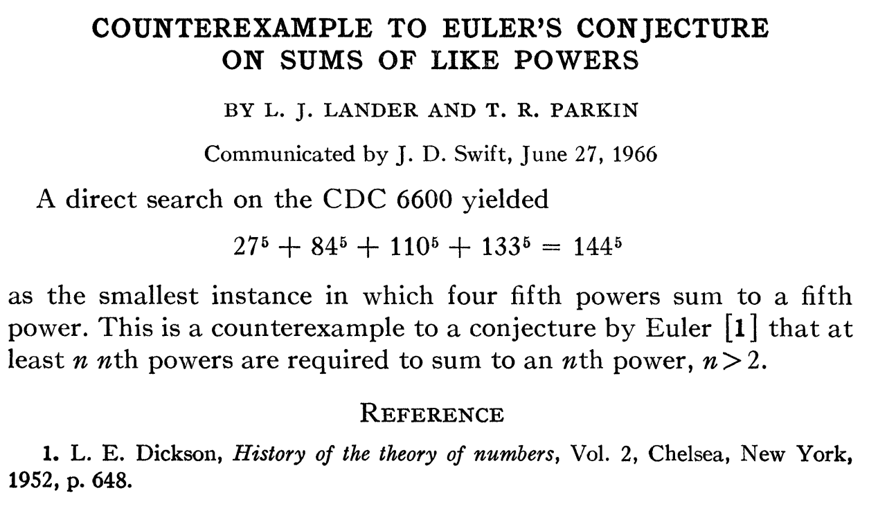 LANDER, L. J., & Parkin, T. R. (1966). Counterexample to Euler’s conjecture on sums of like powers. Bulletin of the American Mathematical Society, 72(6), 1079. [doi:10.1090/s0002-9904-1966-11654-3]