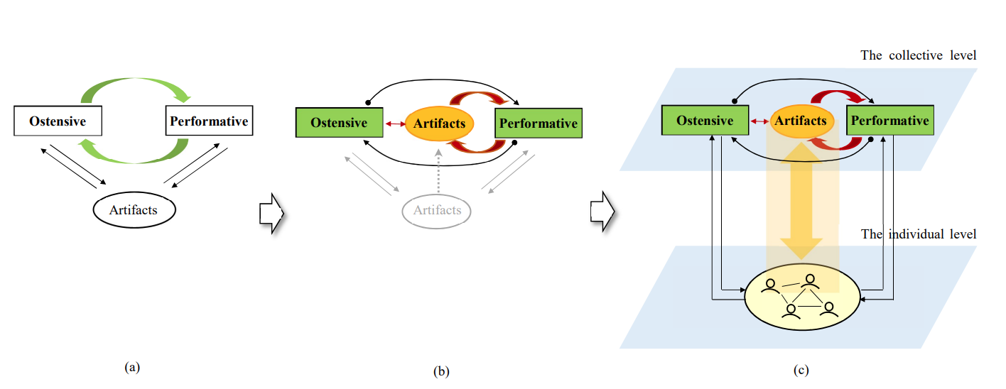 It has been widespread consensus that routines are certain generative systems consisting of two distinct aspects (Feldman et al. 2016; Feldman & Pentland 2003). One is the ostensive, referring ‘the ideal or schematic form’ of a routine that shapes people’s perception of what the routine is’, or ‘the routine in principle’; the other one is the performative, referring ‘the specific actions taken by specific people at specific times’, or ‘the routine in practice’ (Feldman & Pentland 2003 pp. 101–102). These two aspects are recursive and mutually constitutive, implying that the ostensive not only guides performances, but also is created and recreated from them (Pentland & Feldman 2005, 2008). In any practical setting, Pentland & Feldman (2005) asserted that the two aspects may ‘be codified or prescribed, as well as enabled and constrained’, by various artifacts (P.795). Those artifacts as physical manifestations reflect and influence both the ostensive and performative aspects of routines. Pentland & Feldman (2005), Pentland & Feldman (2008) placed artifacts outside of the routine itself to illustrate the interactive influence of artifacts and routines (see in Figure 1a), stating that artifacts were ‘different from either the specific performance or the abstract patterns’ and that they ‘can be incorporated into the routine in a variety of ways’ (Pentland & Feldman 2008 p. 244).