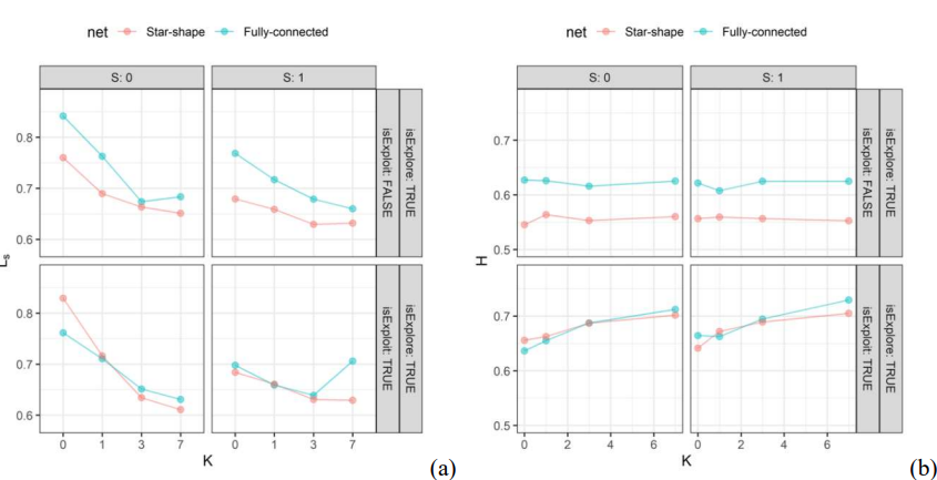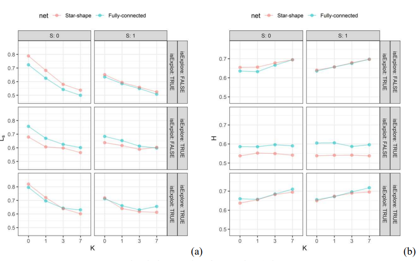 In terms of exploration (e.g., as shown in the middle line of Figure 10a and 10b, the Fully-connected network facilitates communication and imitation between agents. This promotes distant or long jump of strategic search of agents. Therefore, the Fully-connected network performs better than that of the Star-shape network with much higher levels of the synchrony of individual actions \(L_{s}\) and organizational performance \(H\). Additionally, although the variation of \(K\) and \(S\) values to a large extent affects the output \(L_{s}\), it has no significant impact on organizational performance \(H\).