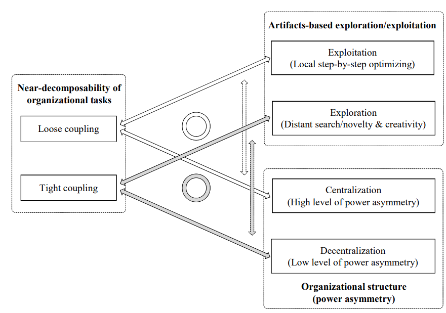 When dealing with tight coupling organizational tasks, decentralized organizational structure (i.e., represented by the low power asymmetry and the Fully-connected network) accelerates the communication and imitation between human actors, encouraging exploration across the community to improve fitness with the environment and avoid the rigidity and inertia in routines performances. In such cases, it is better to have those formal rules and procedures of material artifacts which are open and goal-oriented to encourage innovation and creativity (Weichbrodt & Grote 2010) through undertaking explorative activities.