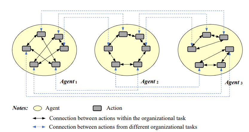 In our setting, the organizational activity is performed simultaneously by \(Q\) agents (i.e., human actors) within a community. Each agent \(q\) (\(1 \leq q \leq Q\)) faces an organizational task that can be expressed as the vector of \(N\) component actions \(action_{q} = (a_{q,1}, \dots, a_{q,n}, \dots, a_{q,N})\). The total tasks of the community can be depicted as that: