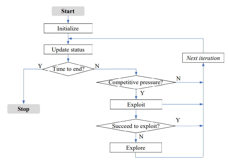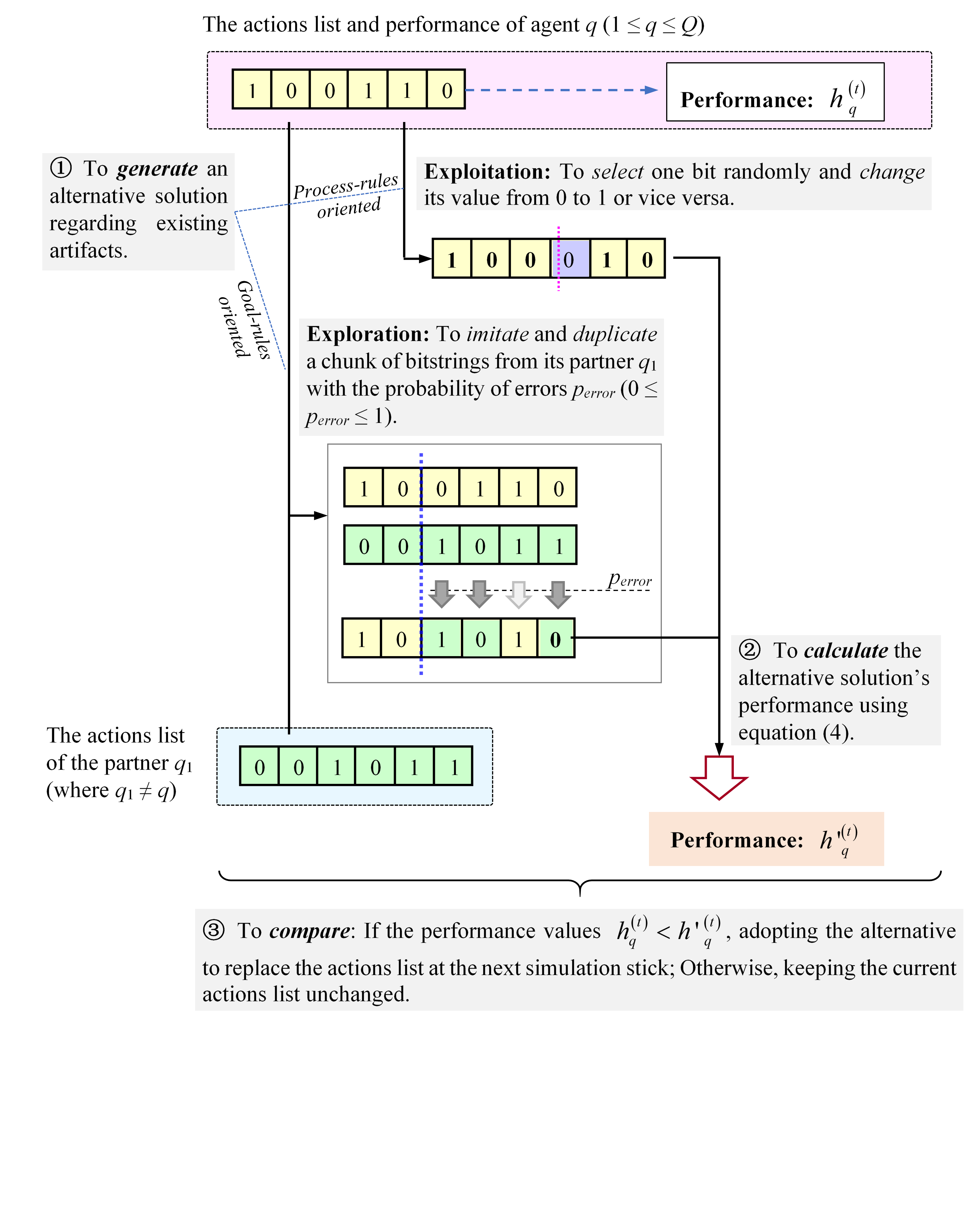 When the agent faces competitive pressure (e.g., having the smallest performance value among its neighbors), it tends to achieve exploitation based on its understanding and interpretation of existing artifacts. Exploitation refers to agents’ utilization of process-rules within artifacts and their locally search for incremental improvements towards the optimal solution step-by-step, despite being limited by their myopia. For example, an agent randomly selects only one bitstring of its actions list at a time, and vary the bitstring’s value from 0 to 1 or vice versa. If the agent finds the alternative solution outperforms its current state (i.e., with a better performance value \(h^{(t)}\)), it then adopts that solution at the next simulation tick.