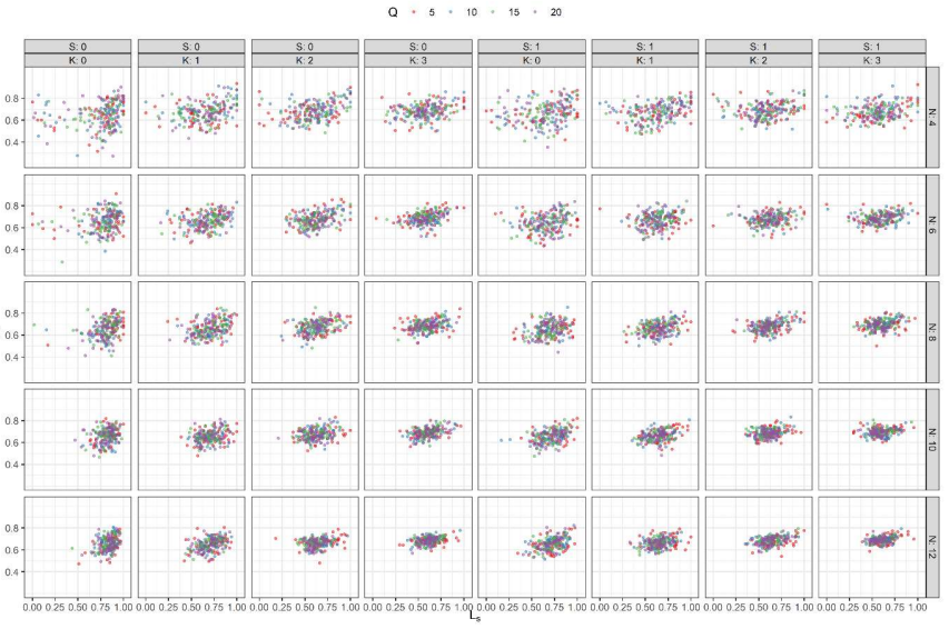 When comparing the impact of \(K\) and \(S\) values on the simulation outputs, we observe the very distinct patterns as demonstrated in Figure 9a and 9b – i.e., increasing the stickiness of individual actions (e.g., the increase of either \(K\) or \(S\) values) to a certain degree decreases the synchrony level of actions \(L_{s}\), but it positively affects the community’s performance \(H\). This implies that organizational designers need to make a trade-off between these two factors.