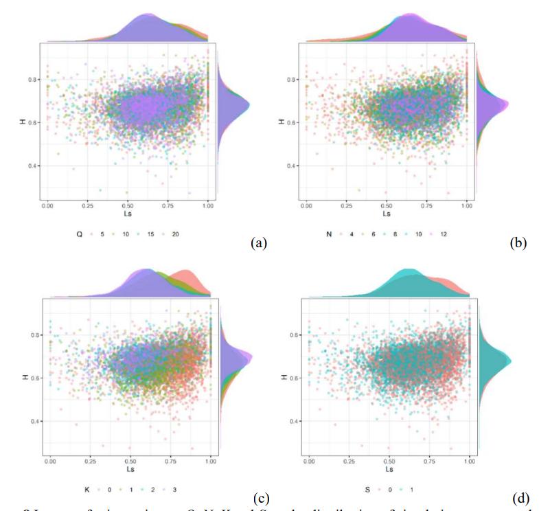 Input-output relations of the simulation model under the benchmark scenario are shown in Figure 7 and Figure 8, which indicate that the change of \(Q\) and \(N\) values only affects the range of variation but not the median values of the distribution of output series including the synchrony of the action sequences among agents \(L_{s}\) and the community’s performance \(H\) (see in Figure 7, Figure 8a and b). However, there is a negative relationship between \(Q\) values and the simulation output \(L_{s}\) (see in Figure 8a). The community size \(Q\) and the component complexity of organizational tasks \(N\) determine the scale of our simulation model. With the increase of \(Q\) and \(N\) values, it would lead to a larger-scale problem to be solved, requiring much computation resources and cost of time for all the simulation runs.