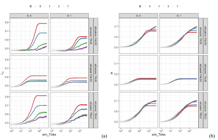 We then check the consequences of non-parameter inputs including both exploitation and exploration rules of the agents (i.e., \(isExplore = isExploit = FALSE, TRUE\)). We set the actual number of simulation runs for each parameter configuration \(numSimRuns_{actual} = 150\) with the estimated expected power (EEP) bigger than 0.90, and keep each simulation run lasts 6000 rounds. We calculate mean values of each simulation output over all simulation runs (as shown in Figure 9a and 9b), from which we conclude that: