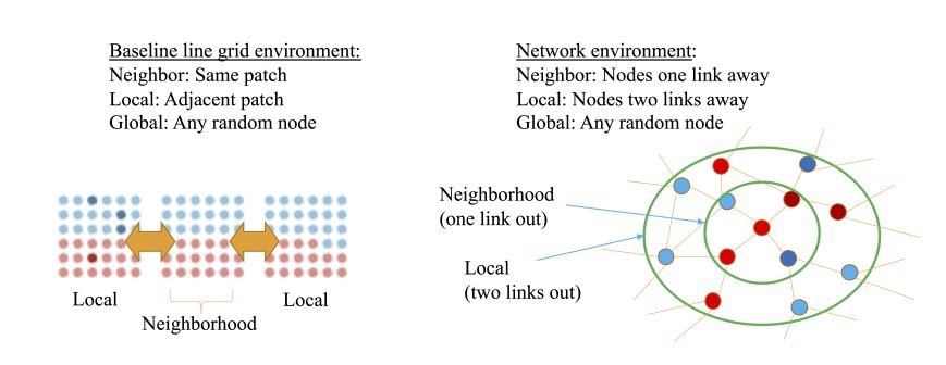 The network environment proposed by the models have a history across multiple disciplines. Random networks were described and explored by Erdos & Renyi (1960). A general history of networks across disciplines is described by Barabasi (2016). Borgatti describes the role of networks from a range of disciplines from psychology, political science, anthropology and economics (Borgatti et al. 2009). One of the first examples of the role networks play in imitative behavior was in Moreno’s study of runaways at an orphanage that was tied to social network connections (Borgatti et al. 2009; Moreno 1934). A significant development was the discovery of the concept of “small world” networks (Watts & Strogatz 1998) that helped to explain the “six degrees” problem in Milgram (1967) and the strength of weak ties (Granovetter 1973). Mapping degree distributions of real networks from power grids, highway systems, airline routes, the world-wide web and the internet showed that many networks had a structure defined by a preferential attachment mechanism i.e. new nodes are not attached randomly but prefer nodes with higher number of connections or edges (Barabasi & Albert 1999). The degree distributions for these follow a power law curve (Barabasi & Albert 1999). These random, small world and preferential attachment networks inform the network environment decisions for the model used. Network science continues to be explored to understand phenomenon in many disciplines ranging from sociology to socio-ecological systems to biology to online social network analysis. Of particular importance to the understanding of group phenomenon is the ability to identify communities defined by non-random connections between nodes. This concept was first developed in the study of groups and subgroups in the social sciences (Wasserman & Faust 1994). Methods to efficiently determine these network driven communities were developed by Newman (2006) and referred to as modularity. The other choices of network metrics were informed by the metric descriptions in Barabasi (2016) and Newman (2018).