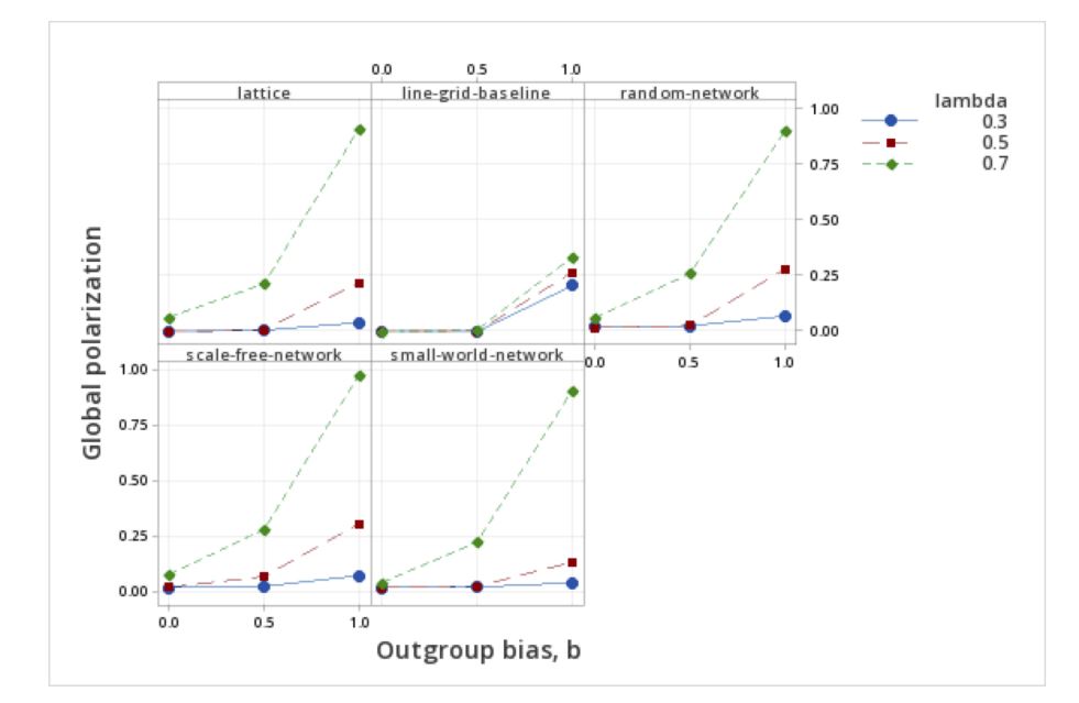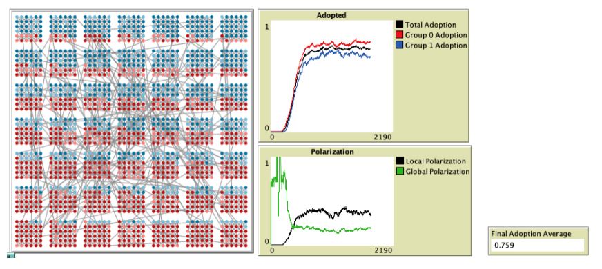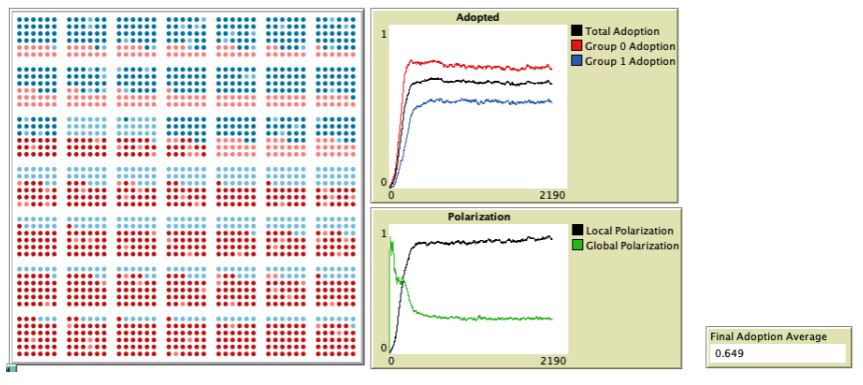 Figure 11 shows a sample run graph for the line grid baseline and Figure 12 shows a sample run for the lattice network, both with default parameter values. The sample run graphs are consistent with the results in Table 6 showing higher adoption, lower global polarization and lower local polarization for the lattice network compared to the line grid baseline.