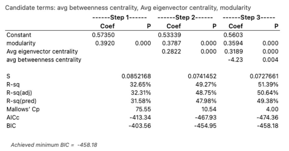 - are directionally impacted by network characteristics (average eigenvector centrality, average betweenness centrality, mean path length, modularity, and average clustering coefficient).