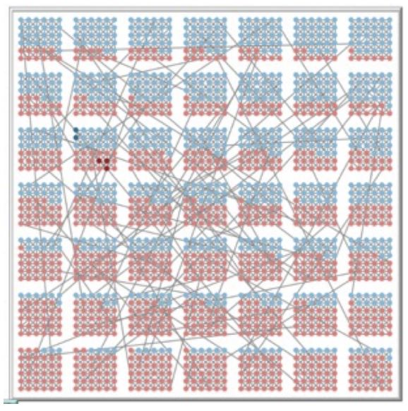 The first step in the model is to create the environment on which the adoption process will take place. Multiple network environments were tested with the modified model. A simple lattice network was created using the baseline environment and extending links within a radius of one from each agent. Additionally, to ensure a connected component, a random proportion of agents are reconnected to other agents. With this wiring, the network resembles a hybrid between a lattice and a small-world network. A modified lattice with random connections is shown in Figure 2. The red and blue nodes represent group membership and the proportions of red or blue skew within each grid square can be seen in Figure 2. The wiring across grid squares are the random reconnections to ensure the network is a connected component. The dark red or dark blue nodes indicate the early adopters’ initial position. Other networks were also tested with a consistent number of nodes and edges, all with an average degree of approximately six. The other networks consisted of a random network (Erdos & Renyi 1960), a pure small world network (Watts & Strogatz 1998), and a scale-free network (Barabasi & Albert 1999). These networks were selected as frequently referenced structures from literature covering a range of degree distributions and characteristics (Newman 2018).