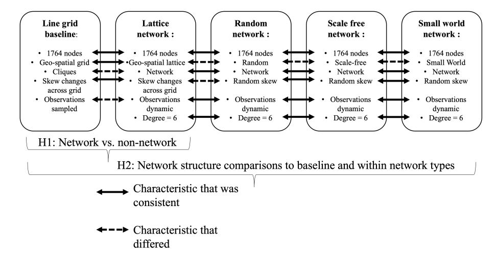 For this study, the non-lattice network models were adjusted to give approximately equal numbers of nodes and edges of each network option, using the degree consistent with the lattice option. See the Appendix for the node and edge counts by network type. Figure 3 shows how the two hypotheses span the environments considered and what variables were modified for these tests.