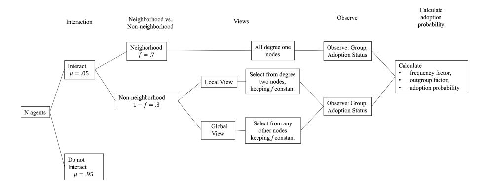 Figure 4 provides a visualization of the decision tree for an agent at each time increment in the model. The probability \(\mu\) defines the likelihood of an interaction. The interaction probability represents the portion of the population that will be making an adoption decision at any particular time interval. The model consists of agents who observe other agents in their immediate neighborhood, followed by observing agents beyond their neighborhood: either one step removed from the neighborhood observation range (local observer view) or randomly in the environment (global observer view). These act as proxies for the influence of close relationships vs. indirect influence factors. The proportion of neighborhood observations to total observations is the ratio, f. This ratio allows varying the level of influence between close relationships (neighborhood) vs. more indirect influences (local or global observer views).