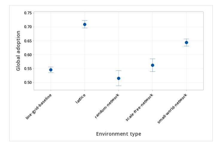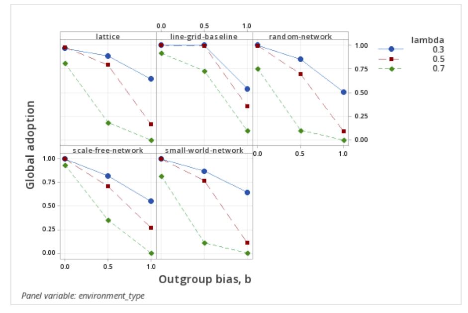 A limitation of this analysis is that the network metrics were not orthogonally tested as a designed experiment, given that the characteristics measured are the result of generating each network. The statistical analysis should be considered directional i.e. that about half of the adoption variation can be explained by network characteristics. While in this study the network type and the associated metrics were examined, further analysis may consider outgroup effects related to social diffusion from the number of community dimensions, the degree of homophily and consolidation, and network bridge width (Centola 2015).
