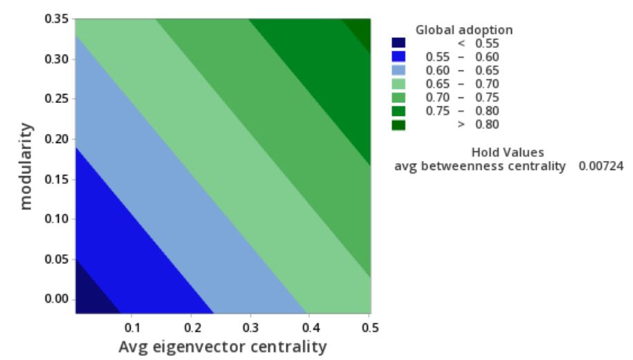 Holding other parameters at default levels, the two most significant network characteristics influencing adoption are modularity and average eigenvector centrality. Examining this effect statistically showed these two factors as having the largest contribution to adoption variation (Table 8). Figure 7 shows that as both modularity and average eigenvector centrality increase, adoption also increases. To the extent that the network structure is driven by group membership compared to a random structure (modularity), adoption tends to be higher. For example, if the network relationships are from work, church, or similar political affiliation, and the group takes a position on adopting or not adopting an innovation, then there is a higher likelihood of impacting the rate of adoption. Vaccination decisions may be an example where getting vaccinated was associated with political affiliations and information emanating from political parties (Ivory et al. 2021).