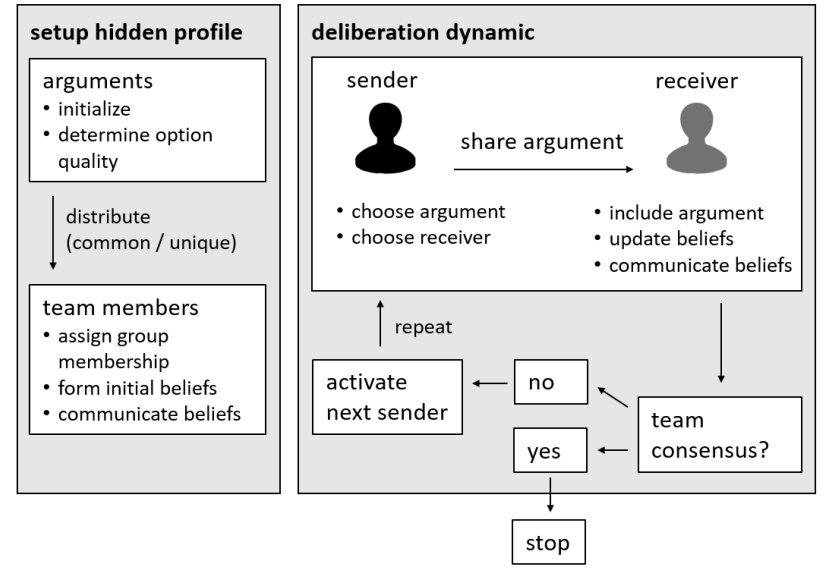 The virtual teams in our model face a decision problem, in that the best option \(o_{max}\) out of a set of \(J\) discrete options needs to be identified. Every team member forms her own belief about which decision option is best but is open to influence by other team members. Influence is implemented as a sequence of communication events (right side of Figure 1). Agents take turns in sharing an argument with an interaction partner. Every time an argument is emitted, the recipient updates her beliefs and tells her team what option she currently believes to be best. This influence process continues until all agents prefer the same option. This option is the team´s decision. Alternatively, if no consensus is reached after a large number of interaction events (5,000 interactions), the simulation is stopped.