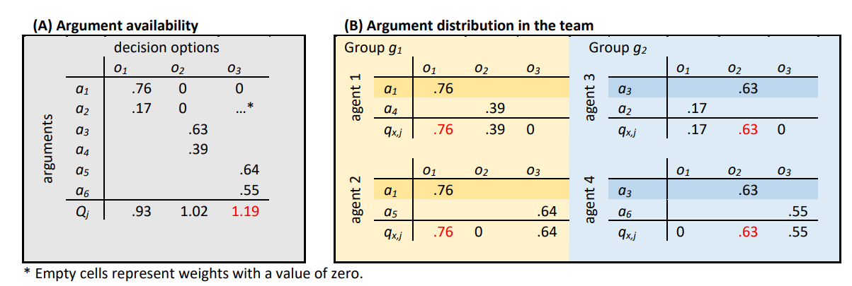 To create a decision problem as implemented in the hidden profile paradigm, we assume that there is a set of \(I\) arguments \(A = \{a_{1}, a_{2}, \dots, a_{i}\}\) pertaining to a predefined set of \(J\) decision options \(O = \{o_{1}, o_{2}, \dots, o_{j}\}\). An example of a set of arguments and decision options is presented in Figure 2A. The set of arguments is fixed, implementing a setting in which agents cannot invent new arguments during the deliberation process. Following common practice in hidden profiles, we define the set of arguments and options prior to the start of the decision process. This excludes the possibility that agents come up with ‘creative’ solutions, which would be hard to design, track, and explain in a simulation. Each argument contains \(J\) weights reflecting the degree to which the argument supports the different decision options, i.e. \(a_{i} = \{w_{i,1}, w_{i,2}, \dots, w_{i,J}\}\). Following the standard assumption of the hidden profile literature, we assume that each argument has a positive weight for only one of the options and a weight of zero for the other options. We further assume that there is an equal number of arguments with a positive weight for each decision option. For a given simulated team, weights are randomly drawn from a uniform distribution so that \(w_{i,j} \in [0, 1]\) The sum of the weights associated with a decision option determines its true quality \(Q_{j} = \sum_{1}^{i}w_{i,j}\), and the decision option \(j\) with the highest quality is the optimal option, \(o_{max}\).