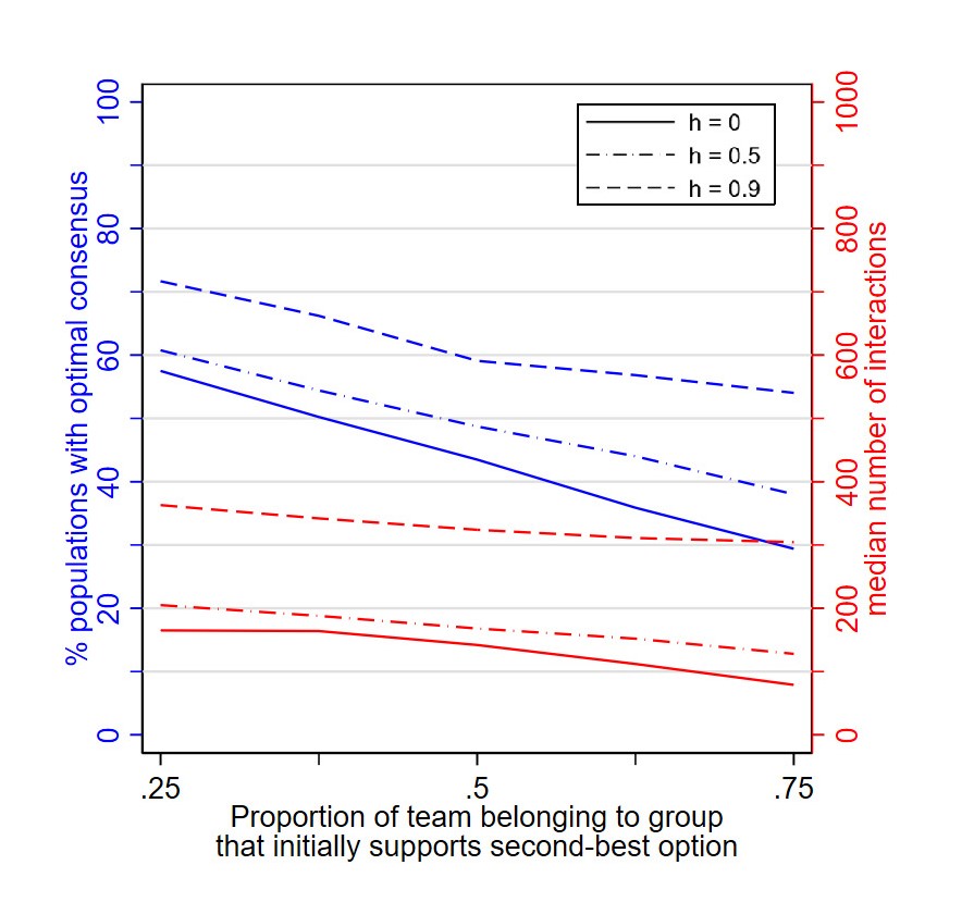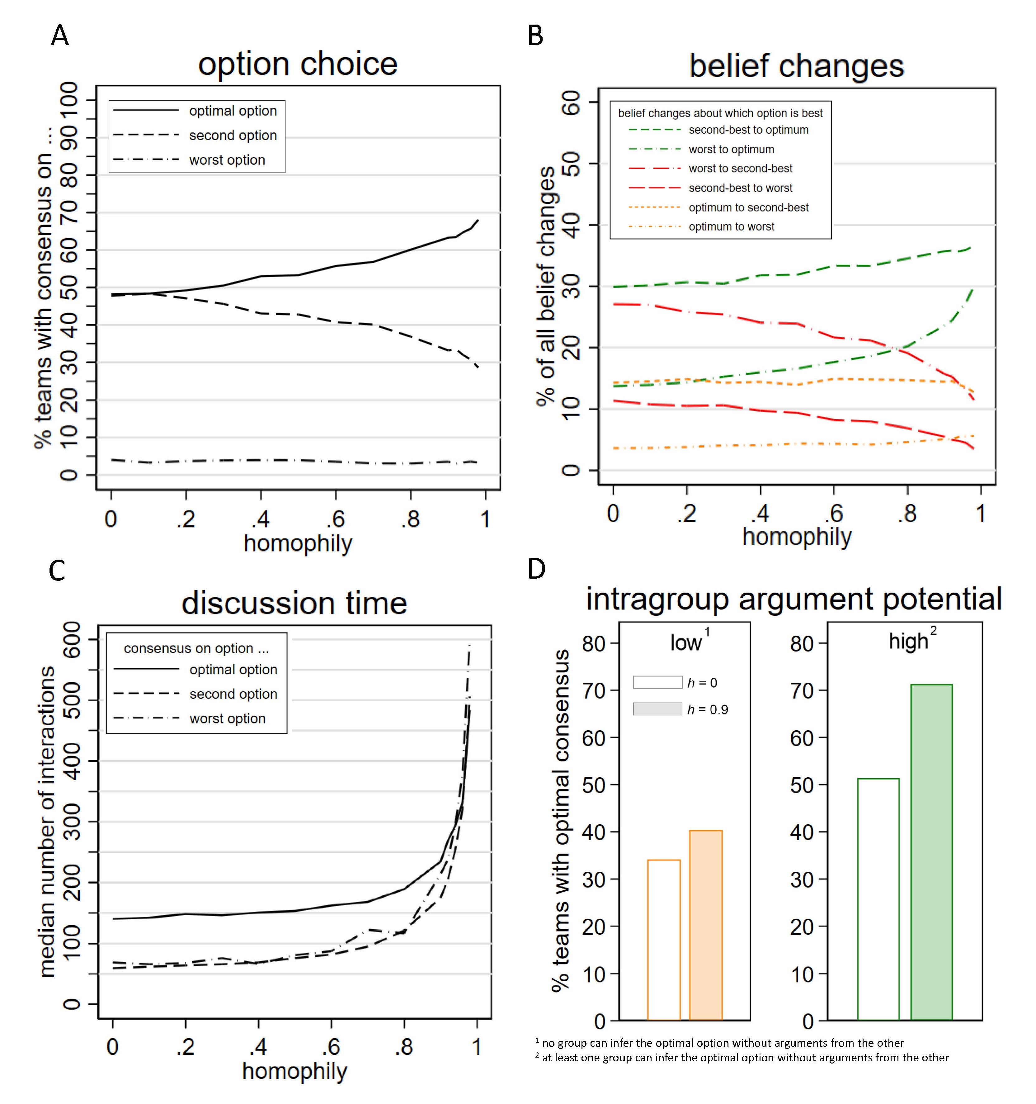 This explanation implies that homophily has a much more powerful effect when at least one of the groups has sufficiently strong optimal arguments to identify the best option by themselves and without the help of the other group. Figure 3D supports this conjecture, showing how homophily increases the share of teams with optimal consensus to a great extent (i.e., from 51% with \(h = 0\) to 71% with \(h = 0.9\)) when the arguments initially provided to one group are sufficient to infer the optimal option. However, when neither group can infer the optimal option without the other, homophilous interactions still increase the chances of making optimal consensus, but only slightly (34% to 40%). The smaller effect is explained by the fact that homophily still prolongs discussion time, making it more likely that optimal unique arguments spread within groups by chance. Altogether, it follows that homophily improves consensus quality mostly because it grants one group with the time to uncover unique arguments and arrive at the optimal option. At the same time, it hinders another group from quickly convincing the team to prefer a suboptimal option through the dissemination of inferior arguments.