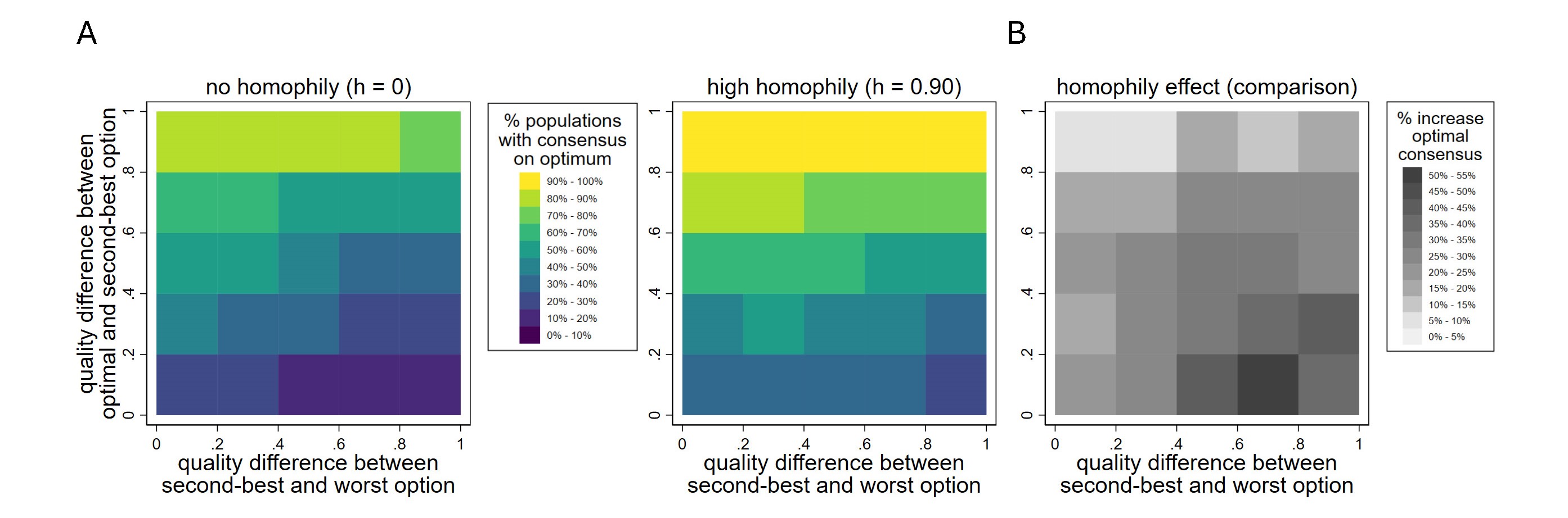 In Figure 4A, we present the percentage of homophilous versus non-homophilous teams with optimal consensus by their differences in quality between the optimal and the second-best option, and the differences between the worst and the second-best option. As suspected, a smaller difference between the optimal and the second-best option increases the chances of finding optimal consensus. Greater differences between the second-best and the worst option, on the other hand, lead to lower proportions of optimal consensus. Comparing the fraction of populations with optimal consensus under high homophily versus no homophily, the previous finding persists that higher homophily levels render more populations with optimal consensus. This supports our explanation and shows that the positive effects of homophily we observe generalize to a wide set of different combinations of option quality.