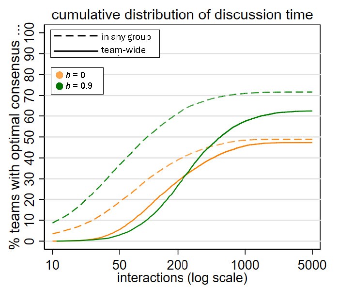 A comparison of teams with and without homophily reveals that at any discussion length, more teams will have reached consensus on the optimal option in either group when homophily is high (dashed lines in Figure 5). This finding aligns with previous results that homophily facilitates optimal consensus within a group without influence from the other group (compare Figure 3D). However, teams with high homophily also need more time from the first occurrence of optimal consensus within a group until team-wide optimal consensus is established. The reason behind this is that homophily also slows down the sharing of arguments from the group with consensus on the optimal option to the other group. This contributes to increased discussion time under homophily.