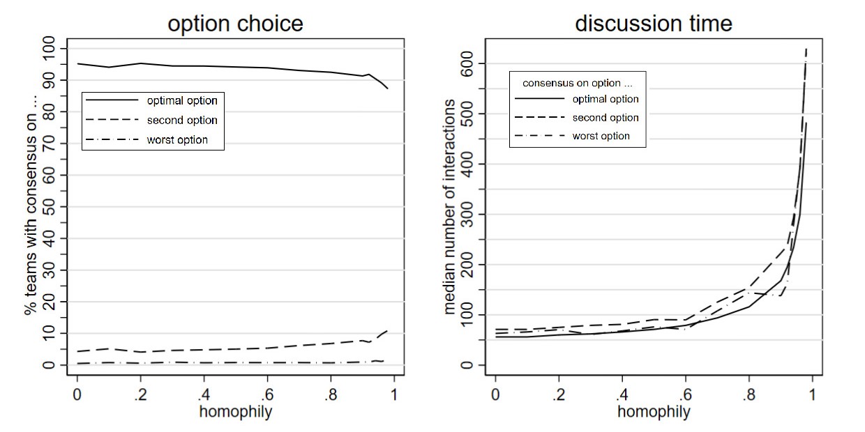 In conclusion, the work presented here provides a novel insight on how to better shape interactions in diverse teams with regards to their decision-making abilities. When tasks are difficult, unbounded communication among team members can cause cognitive diversity to pose a liability. In such cases, homophilous interactions improve decision quality because they keep individuals from convincing dissimilar others with their suboptimal responses too quickly. Pointing to a trade-off between decision quality and efficiency, homophily also resulted in increased discussion time. This is an important finding to consider when finite resources have to be weighed against convex returns to optimal over inferior solutions.