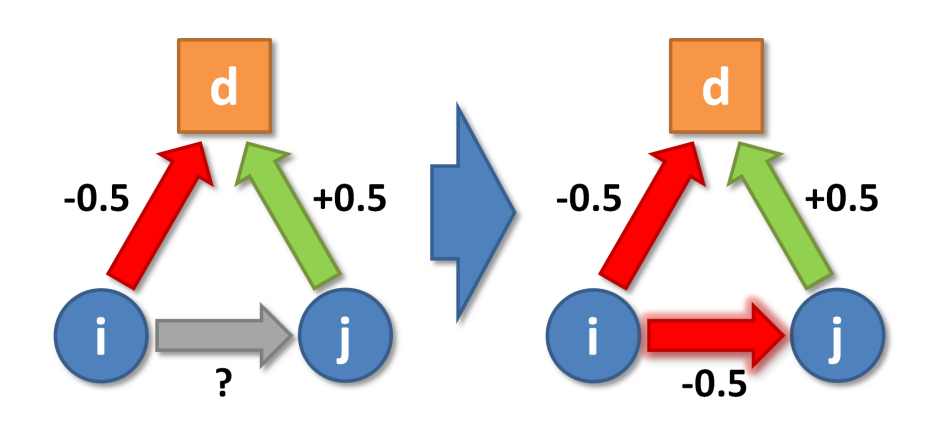 To determine the sign of \(r_{ij}\), we follow the product rule of classical Balance Theory (see Equation 1), which gives the sign of the third relation in a triad as the product of the signs of the other two relations. But this does not solve the question of the weight of \(r_{ij}\). One possibility would be to take the arithmetic mean of \(o_{id}\) and \(o_{jd}\). This, however, would violate requirement 2: For example, if \(o_{id} = 0\) and \(o_{jd} = -1\), the predicted interpersonal relation would be \(r_{ij} = -0.5\). This negative interpersonal relation is not justified, given that \(i\) is actually neutral about issue \(d\).