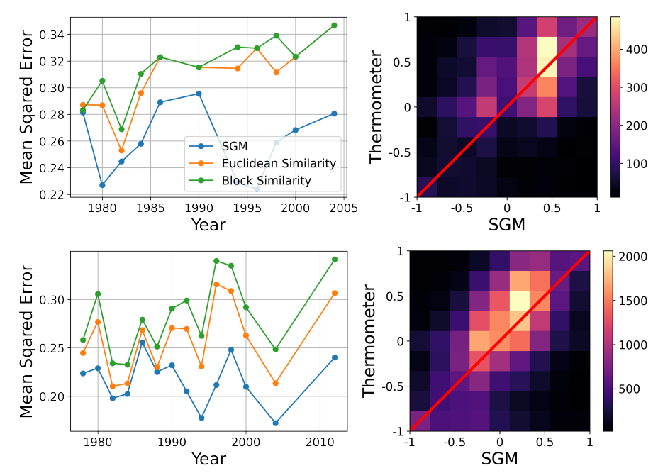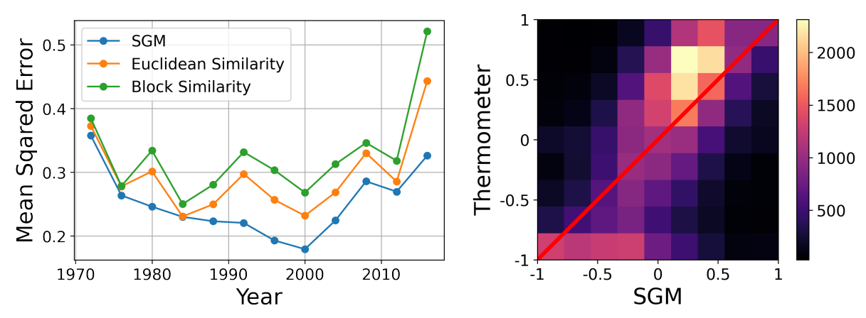 Weighted Balance Theory can be seen as validated if the SGM can estimate thermometer ratings with a higher degree of precision than these two metrics. To make the comparison between these different metrics fair, we apply all three of them without any parameter tuning. This means that for the SGM, we use a fixed \(\epsilon=0.5\) for all respondents and survey waves. The results of this comparison can be seen in Figure 6 (left). Over each of the 12 ANES survey waves, the SGM estimate produces a smaller mean squared error than Euclidean and block distance based similarity metrics. This means that the SGM produces a consistently better estimate of respondents’ thermometer ratings of presidential candidates than the two benchmark metrics.